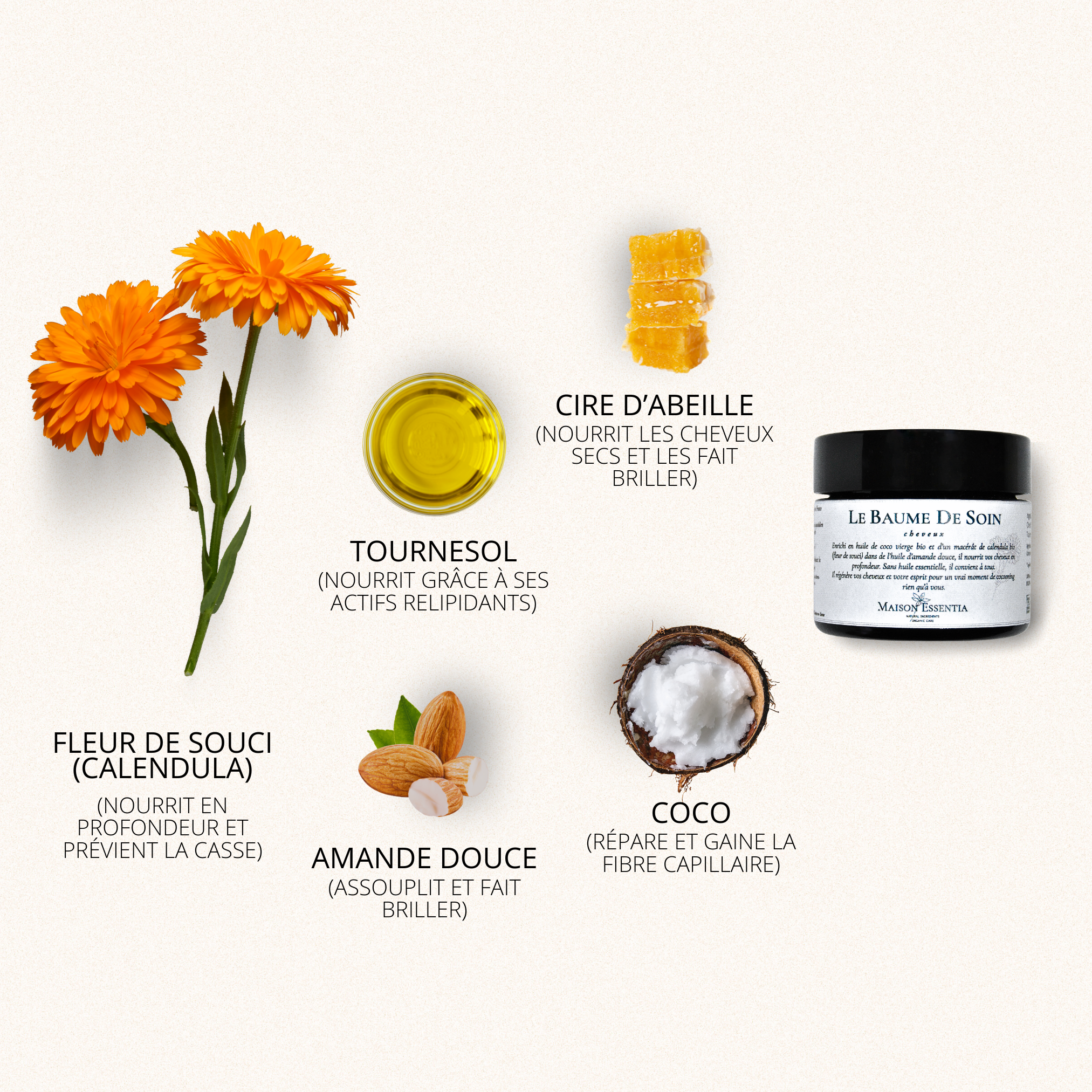 🌼 Le Baume de Soin est formulé avec 100 % d’ingrédients d’origine naturelle et 99,85 % d’ingrédients biologiques. Il est particulièrement adapté aux cheveux secs ou fragilisés puisqu’il aide à maintenir l’hydratation au cœur de vos cheveux. (ne contient pas d'huile essentielle).