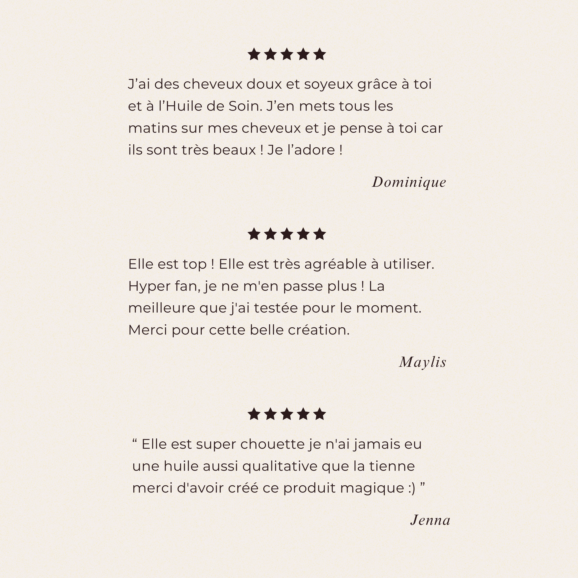 J’ai des cheveux doux et soyeux grâce à toi et à l’Huile de Soin. J’en mets tous les matins sur mes cheveux et je pense à toi car ils sont très beaux ! Je l’adore !