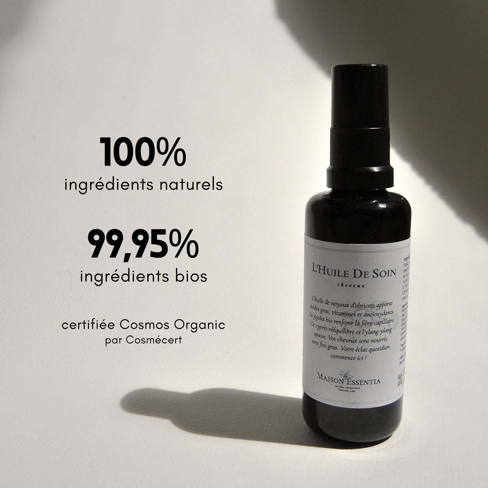 L’Huile de Soin est formulée avec 100% d'ingrédients d’origine naturelle et 99,95% d'ingrédients biologiques.