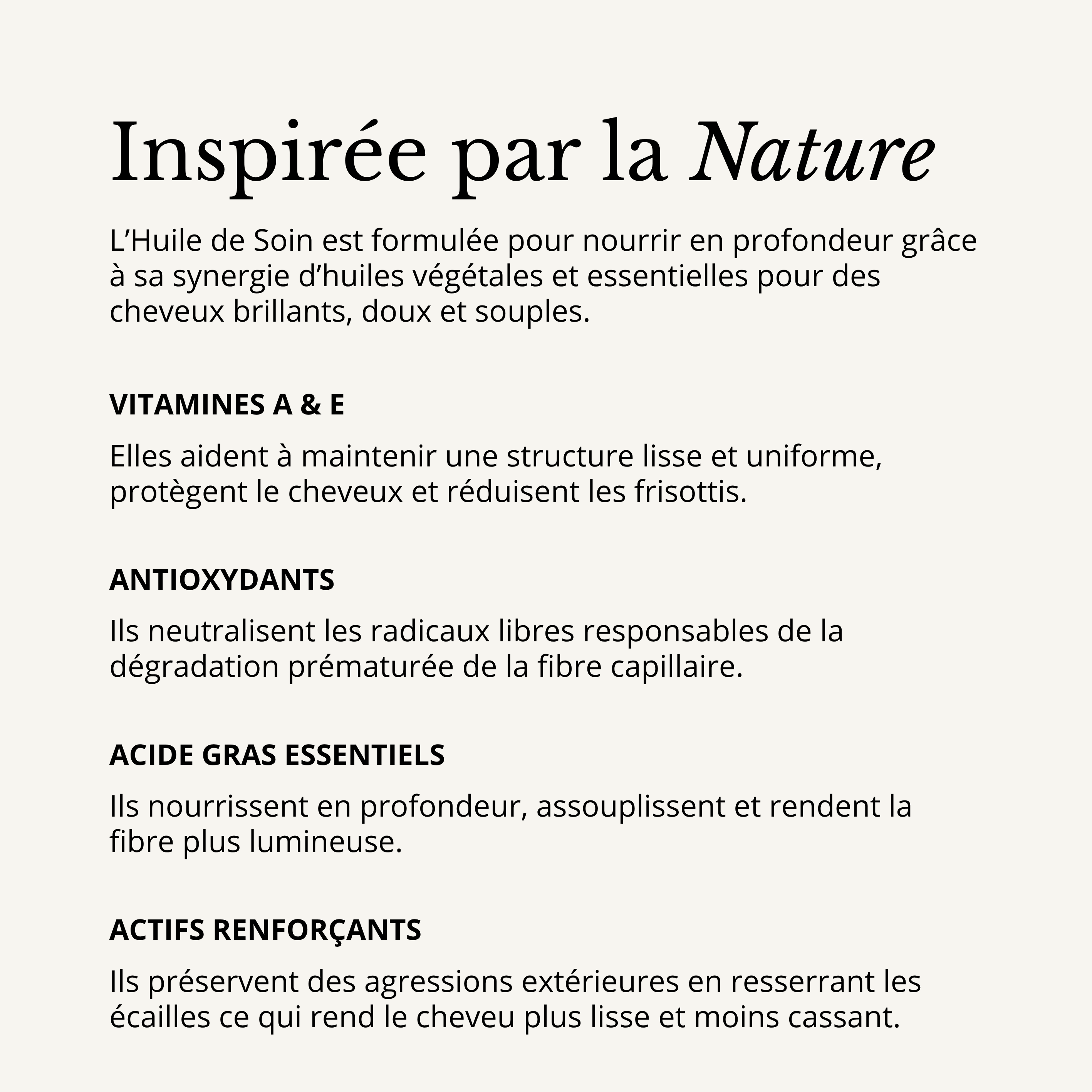 L’Huile de Soin est une huile capillaire clean et spécialement formulée avec des ingrédients sélectionnés avec soin pour leurs bienfaits.
